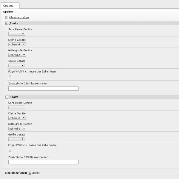 Bootstrap 5 kommt mit einem komplexen Grid-System, um Elemente in den verschiedenen Ansichten optimal positionieren zu können. Im Backend stehen dem Redakteur bei den Grid-Elementen verschiedene Auswahlmöglichkeiten je nach Ansicht (Smartphone, Tablet, Desktop, Großer Bildschirm) zur Verfügung.